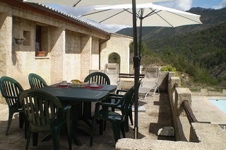 - Grande terrasse avec une table, des chaises, parasol et deux transats
